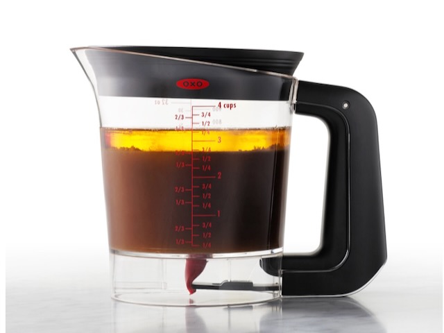 It works seamlessly: the heat-proof cup has a built-in strainer to catch herbs and bits, and the low-positioned spout pulls the flavorful liquid from beneath the fat layer. A comfy, non-slip handle makes it easy to pour with one hand, and the measurement markings are clear and easy to read. It’s simple, sturdy, dishwasher-safe, and one of those kitchen tools that quietly earns its place in your cabinet.