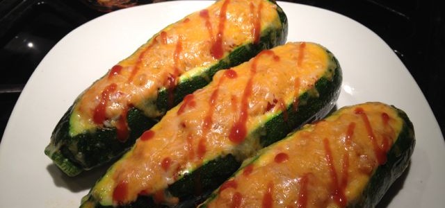 All I did was hollow out a few zucchinis, seasoned them with olive oil, salt, pepper and a dash of chili power and I par cooked them in the oven at 375 degrees. About 10-15 minutes. I pulled them out and then stuffed our leftover taco meat into them, covered them in shredded cheese and cooked until the meat was heated through, cheese was melted nicely and the zucchini finished cooking- so about 15 -20 minutes. I topped them with a drizzle of taco sauce and served.