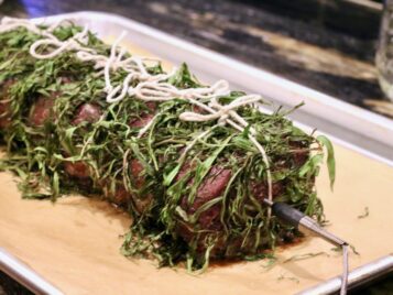 - Cover the filet with aluminum foil and allow to rest for 20 minutes. Remove tarragon & strings, slice thickly and serve warm or at room temperature.